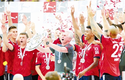 5月12日,拜仁慕尼黑队主教练海因克斯(前中)在颁奖仪式上手捧德甲联赛冠军奖盘。当日,拜仁慕尼黑队获颁2017-2018赛季德国足球甲级联赛冠军奖盘。此前拜仁慕尼黑队已在第29轮提前五轮加冕本赛季德甲联赛冠军,实现德甲联赛“六连冠”。