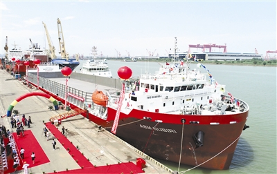 5月16日,由中船重工武船集团自主研制设计和建造的1.3万吨甲板运输船“ABM NUBIRI”在江苏南通举行交付仪式(无人机拍摄)。这是国内首艘纯国产的甲板运输船。