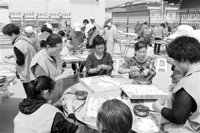 图为日前该县春晖义工协会、县孝和文化协会联合崔池村村委会为村里老人举办孝心饺子宴。