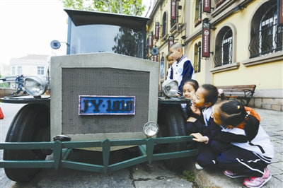 5月16日,青岛包头路小学学生在山东青岛道路交通博物馆了解一款老爷车复制品。