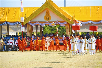 5月14日,在泰国曼谷,人们穿着传统服饰参加春耕播种仪式。泰国一年一度的春耕播种仪式标志着水稻种植季的开始。新华社发(拉亨摄)