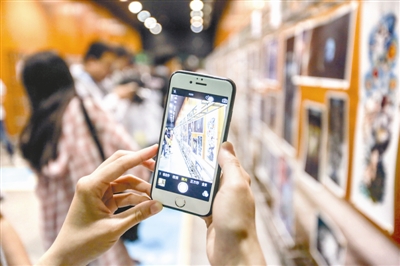 5月19日,在北京中国科学技术馆亚太科幻大会现场,一名游客用手机拍摄科幻艺术作品展。