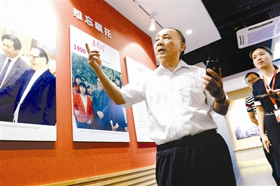 5月8日,全国劳模张伟基在深圳南岭村社区党群服务中心为参观者讲述南岭村历史。他的儿子张育彪也是一名全国劳模。本报记者 吴凡 摄