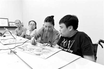 5月20日,一名烙画老师(右二)向廊坊市安次区残疾人教授木板烙画。
