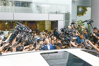5月22日,马来西亚前总理纳吉布(中)在位于普特拉贾亚的马反腐败委员会接受调查问话后离开。