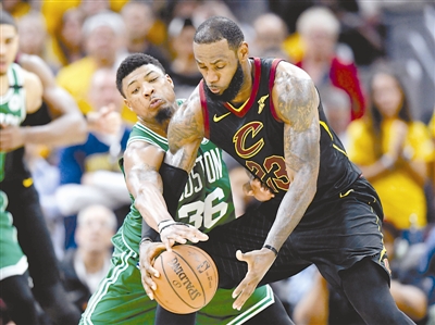 5月21日,骑士队球员詹姆斯(右)在比赛中与凯尔特人队球员斯玛特拼抢。当日,在东部决赛第四场比赛中,骑士队主场以111比102战胜凯尔特人队。 新华社/路透