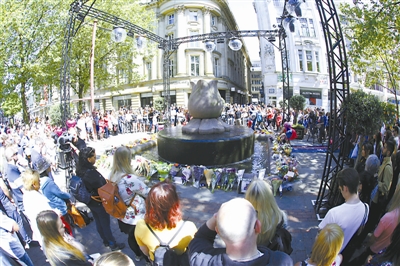 5月22日,在英国曼彻斯特,人们参加悼念活动。