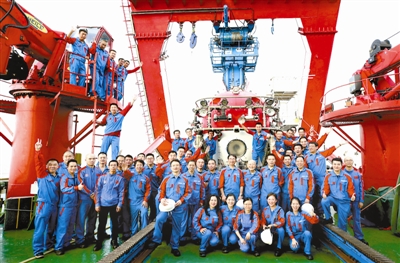 5月23日,“南海深部计划”西沙深潜航次的部分考察队员在“深海勇士”号前合影。