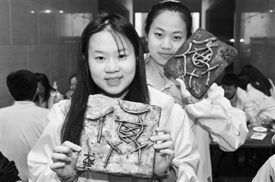 5月24日,在山东烟台王懿荣纪念馆,菲律宾华裔青少年展示制作的甲骨文“福”字。