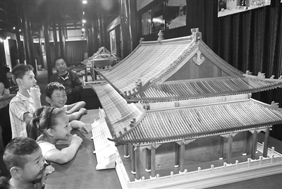 5月27日,江苏省南通市港闸区唐闸镇街道西洋桥社区辖区青少年、流动儿童参观留韵金丝楠木艺术馆展出的金丝楠木古建筑模型。当日,社区组织辖区青少年、流动儿童参观留韵金丝楠木艺术馆和车间,让孩子们体验工匠精神。许丛军 摄/视觉中国