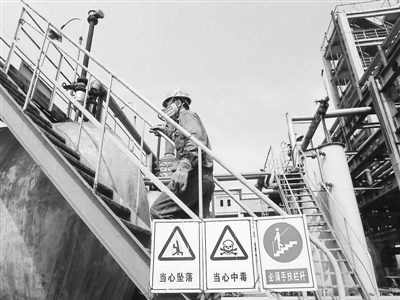 图为5月15日,该公司员工在生产现场按规范要求手扶楼梯巡检。魏玉东 摄