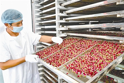 5月27日,在邢台县一家花茶加工厂,工人在查看玫瑰花茶半成品的质量。