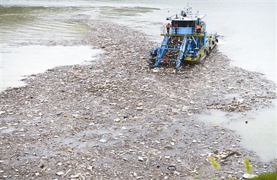 5月27日,巫山县清漂队的新型全机械化清漂船在长江支流大宁河中进行清漂作业。