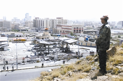 5月27日,在也门首都萨那,一名士兵站在山上望向遭袭的加油站。也门安全部门官员26日说,沙特阿拉伯领导的多国联军当天在也门西北部两个省份和首都萨那实施空袭,造成包括妇女和儿童在内的至少9人死亡,另有数十人受伤。新华社发(穆罕默德 摄)