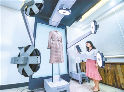 浙江浅秋针织服饰有限公司工作人员在用智能一体成像机拍摄新款产品,该设备可以在几秒钟内完成产品立体视图的拍摄、抠图、上传,大大节省了企业的时间和资金(5月23日摄)。