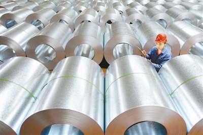 5月29日,唐山市海港开发区一家镀锌钢板生产企业的质检员在检查产品质量。