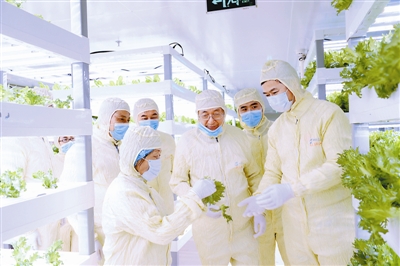 图为中科院院士匡廷云带领科研团队在中科生物植物工厂生产一线研讨绿叶蔬菜的培植。