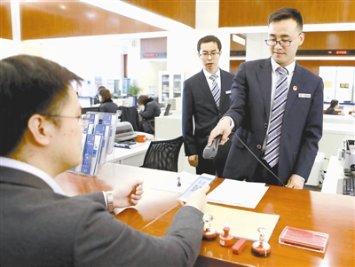 4月9日,中国国家市场监督管理总局推出的手机版电子营业执照在天津自贸试验区东疆片区首批发放。这是工作人员为天津花生好车汽贸有限公司董事长陈鹏云(左一)扫码登记。