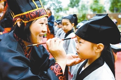 日前,河北廊坊市安次区第二幼儿园举行“知书尚礼 童蒙养正”开蒙礼活动。这是老师为小朋友点朱砂。