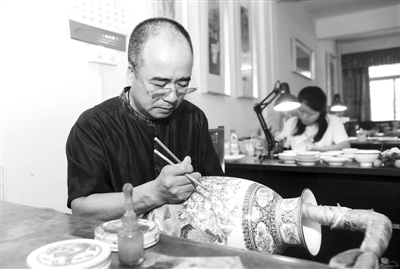 在广辉彩瓷艺术工作室,谭广辉绘制广彩瓷花纹图案(6月3日摄)。