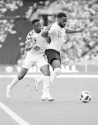 ③ 6月2日,英格兰队以2比1战胜尼日利亚队。图为英格兰队球员罗斯(右)与尼日利亚队球员穆萨拼抢。新华社记者 韩岩 摄