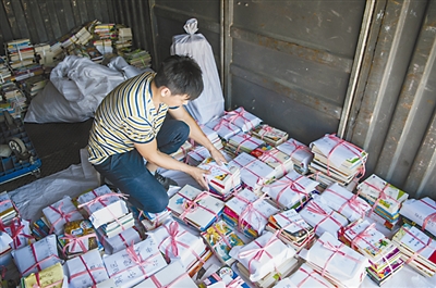 6月4日,北京货运中心双桥货场,工作人员正将图书分类打包准备装车。据了解,这批图书共150万册,全部为北京16个区县的中、小学生在“好书伴成长”活动中捐赠的。6月5日,这批图书将被分装在12个车厢通过货运火车送往4600多公里外的新疆和田地区,实现两地中、小学生之间的知识传递与共享。本报记者 王伟伟 摄
