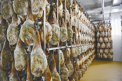 屠宰后洗净的猪会被送入加工车间,工人先是把猪腿上大部分皮下脂肪切掉,只留一小层,然后将猪腿摞好,用大粒盐埋起来。“每小时都要翻动盐堆,调换猪腿位置,这一过程会持续10天,让盐充分浸入而又不致过咸。”火腿加工厂技术负责人拉蒙对记者说。
