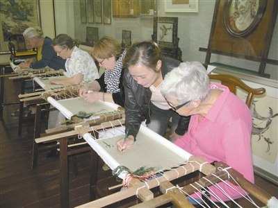 图为外国友人体验沈绣。沈寿艺术馆 供图