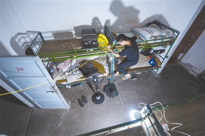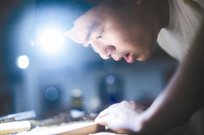 6月3日晚,胡浩正在车间里加班练习,为即将到来的第45届世界技能大赛全国选拔赛家具制作项目做准备。