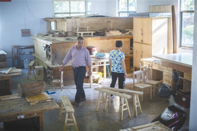 6月1日,一名校职工(右)来到车间要买学生们打的小木椅,陈志高师傅让她自己挑。