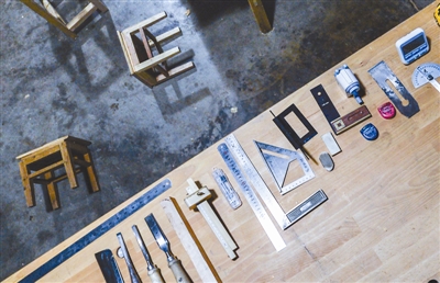 邬江和胡浩俩人的练习台,上面摆放着他们日常需要的木工工具。