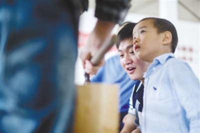 6月2日,一个木匠师傅的儿子看着热闹的教学场面,也全神贯注地投入到了“学习”中。