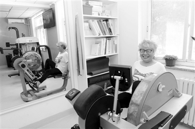 6月8日,一名社区居民在北京市丰台区马家堡社区卫生服务中心锻炼。