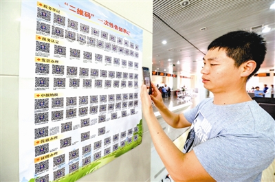 6月12日,在魏县政务服务中心内,一名市民用手机扫描二维码查询办理流程及事项。