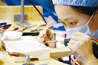 6月13日,一名珠宝加工项目参赛选手正在作业。当日,2018年中国技能大赛——第45届世界技能大赛全国选拔赛上海赛区的比赛,在位于上海的国家会展中心拉开战幕,来自全国46个代表队的约900名选手,将在汽车技术、木工、机电一体化和社会照护等34个比赛项目中进行技能比拼。 本报记者 窦菲涛 摄