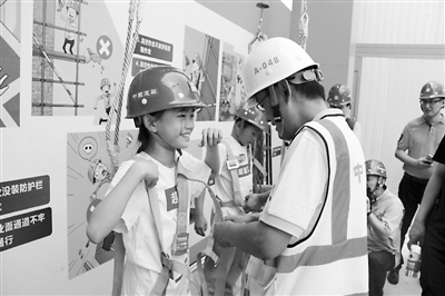 6月10日,在第三届“首都国企开放日”上,一群来自史家胡同小学的小朋友们在中建二局冬季运动管理中心综合训练馆项目体验建筑安全防护设备。此外,他们还参观了该项目所运用的“智慧工地”集成系统。本报通讯员 施婷 马阳 摄