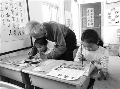 他原本是初中语文老师 ,2000年,他在家中开设“留守儿童之家”,给留守儿童义务辅导功课。工作日周一至周五放学后,孩子们会来这里做作业。图为叶连平在手把手教孩子练习书法。