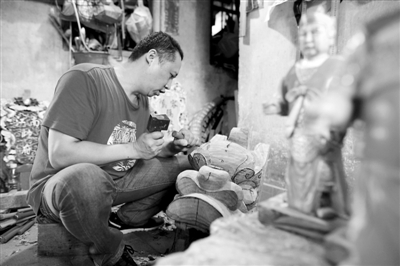 6月8日,广东顺德,梁伟东正在为容桂制作一个全新的龙头,轮廓已按照图纸雕刻出来。