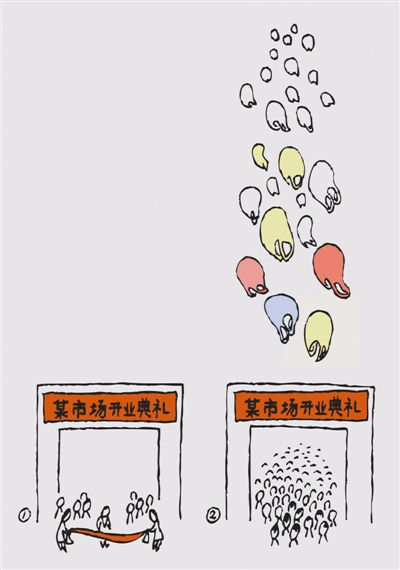 “锣鼓喧天,彩袋飘飘。”此言一出,即感觉这说法存在语病。然而,漫画家周喜悦先生的作品《无题》的确是这样画的:市场盛装开业,各界嘉宾咔咔剪彩,各色塑料袋嗖嗖飞扬。
