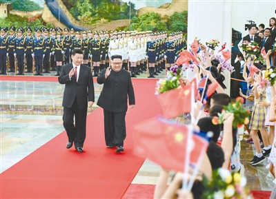 6月19日,中共中央总书记、国家主席习近平同当日抵京对中国进行访问的朝鲜劳动党委员长、国务委员会委员长金正恩举行会谈。这是会谈前,习近平总书记在北京人民大会堂北大厅为金正恩委员长举行欢迎仪式。 新华社记者 申宏 摄