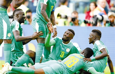 6月19日,塞内加尔队球员尼昂(右三)在比赛中与队友庆祝进球。当日,H组小组赛中,波兰队1:2负于塞内加尔队。这是非洲球队在本届世界杯上的首胜。