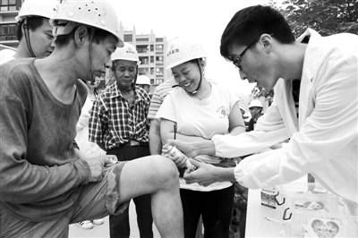 6月19日,志愿者在为外来务工人员演示讲解伤口处理方法。当日,江苏大学医学院志愿者来到镇江市七里甸街道万科社区辖区建设工地,向外来务工人员赠送爱心小药箱,为农民工们传授伤口包扎、处理技能和夏季防暑知识,提供量血压、心肺听诊等义诊服务。石玉成 王雪 摄