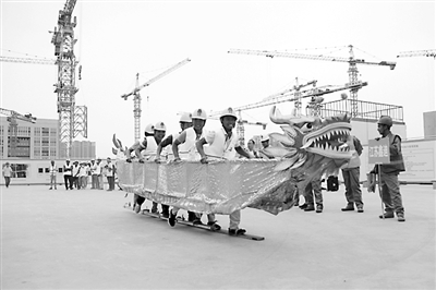 6月15日下午,在北京市丰台科技园36#地项目部端午节农民工趣味运动会上,来自中建二局三公司的几位工人利用现场的钢管做出龙舟的骨架,一位江苏籍工友找来了龙头头尾,和其他工友一起在工地上划起“旱地龙舟”。