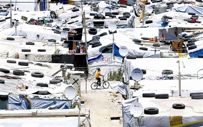 6月19日,在黎巴嫩东部贝卡谷地巴尔伊勒亚斯地区,一名难民儿童在叙利亚难民营内骑车。
