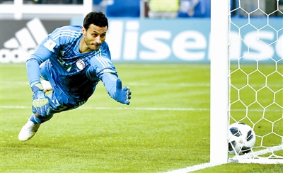 6月19日,埃及队门将艾尔希纳维在比赛中未能扑出队友攻入的乌龙球,俄罗斯队凭借乌龙球取得领先。新华社记者 陈益宸 摄