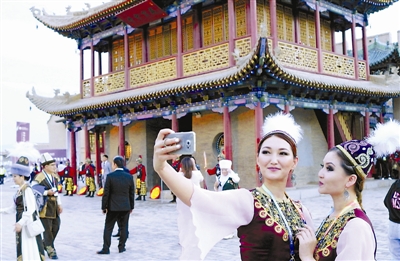 由中国文化和旅游部与甘肃省政府共同主办的第八届敦煌行·丝绸之路国际旅游节,近日在嘉峪关市开幕。图为来自吉尔吉斯斯坦的艺术家在嘉峪关城楼前合影留念。本报记者 康劲 摄