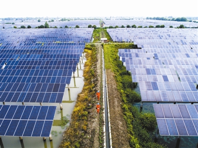 浙江省湖州市和孚镇的“渔光互补”光伏发电项目建设在4200多亩鱼塘上,40多万块太阳能光伏板下养殖小龙虾和青虾等水产,千亩鱼塘与绿色光伏电站构成一幅和谐的生态美景图。