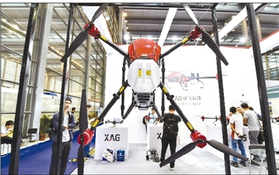 图为6月22日,参观者在展会上观看一架农用无人机。