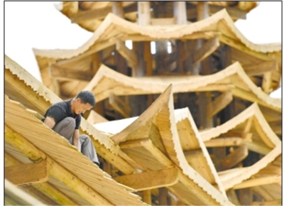 6月22日,工人在湖北省宣恩县高罗镇龙河村一座风雨桥上安装雕花桥檐。