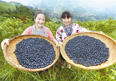 6月23日,村民在广西融水苗族自治县白云乡高兰村蓝莓种植基地里展示刚采摘的蓝莓。
